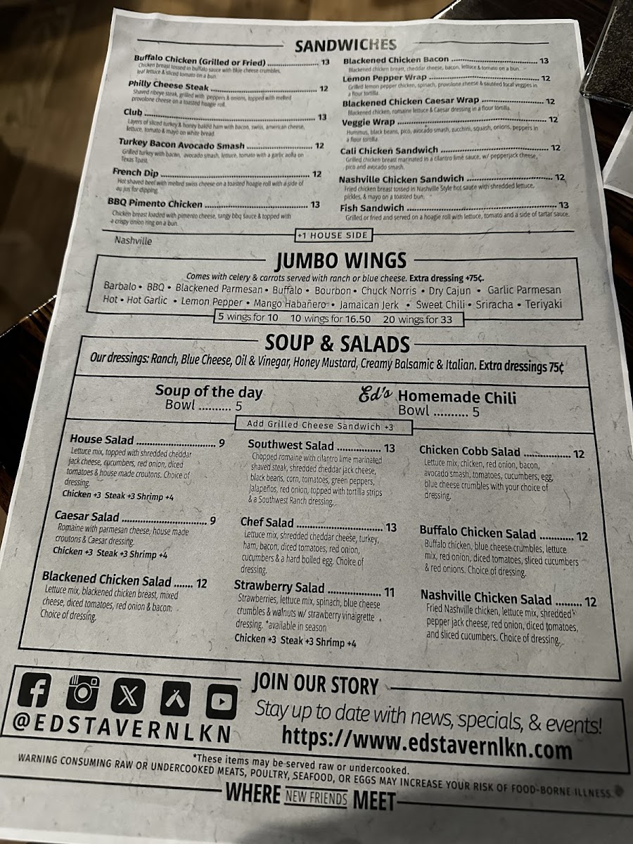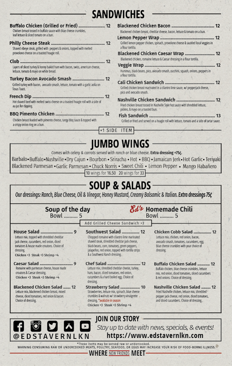 Don’t miss the tantalizing quesadillas, where choices like Buffalo Chicken and Philly Steak provide great variety. With rave reviews about the attentive staff and delightful dishes, Ed's Tavern LKN promises a memorable dining experience that will keep you coming back for more.